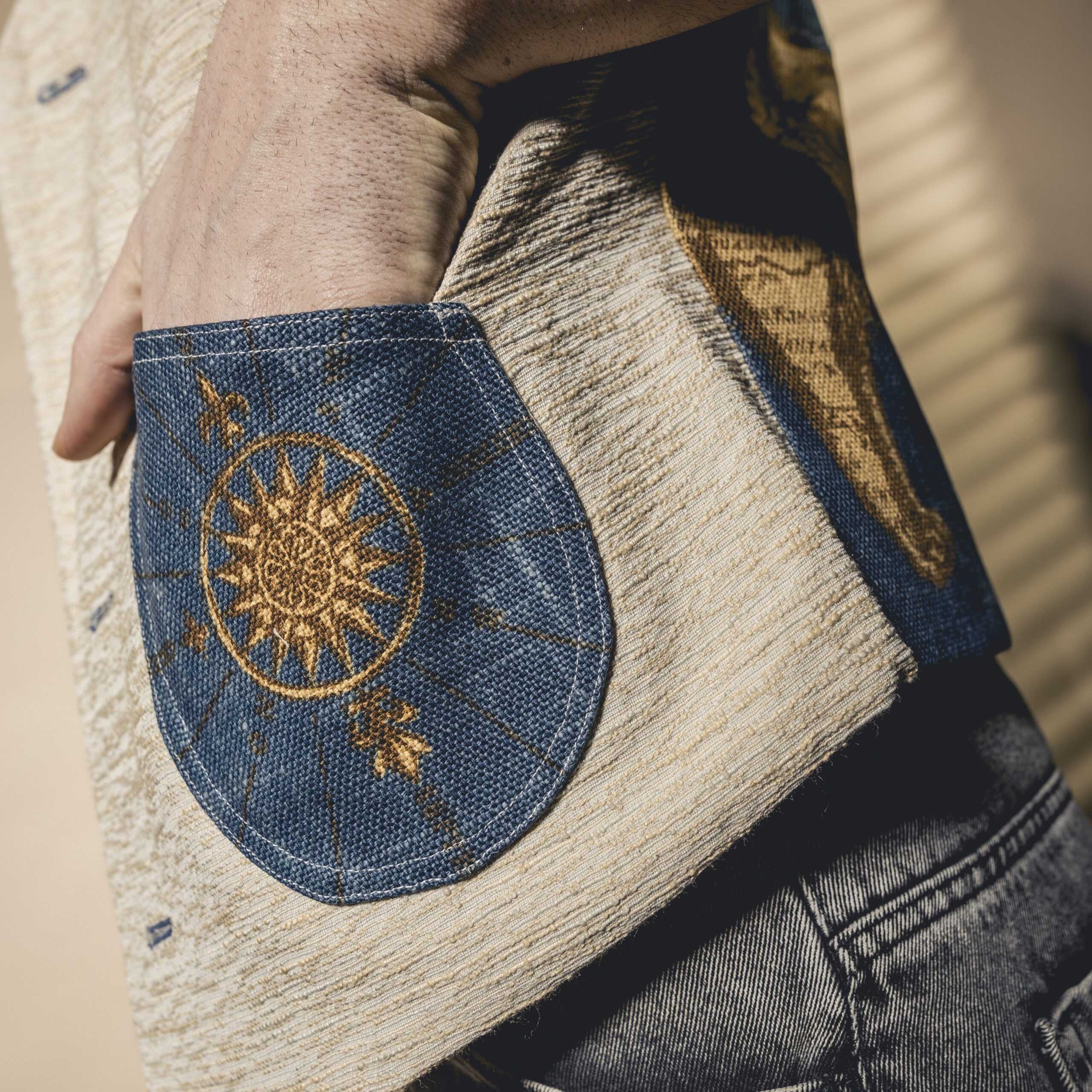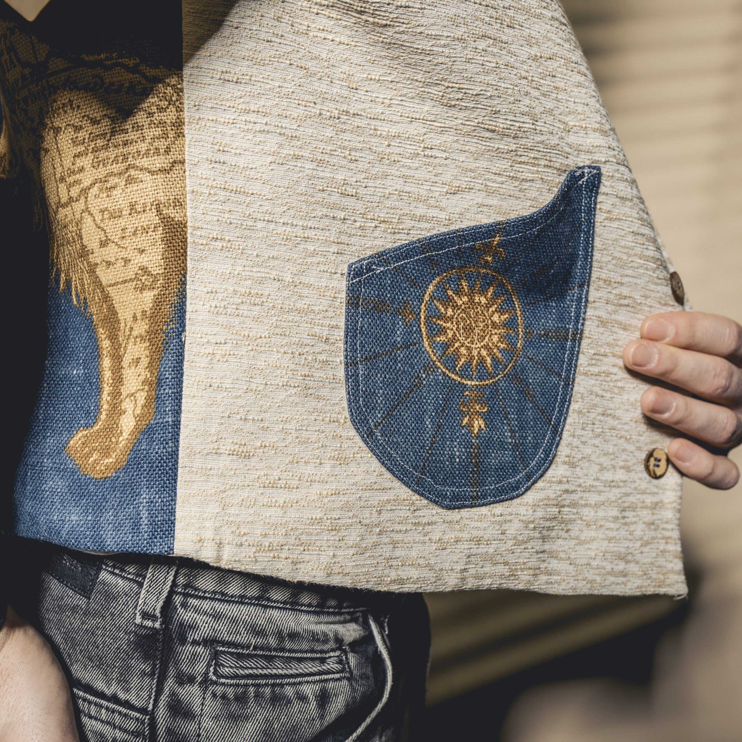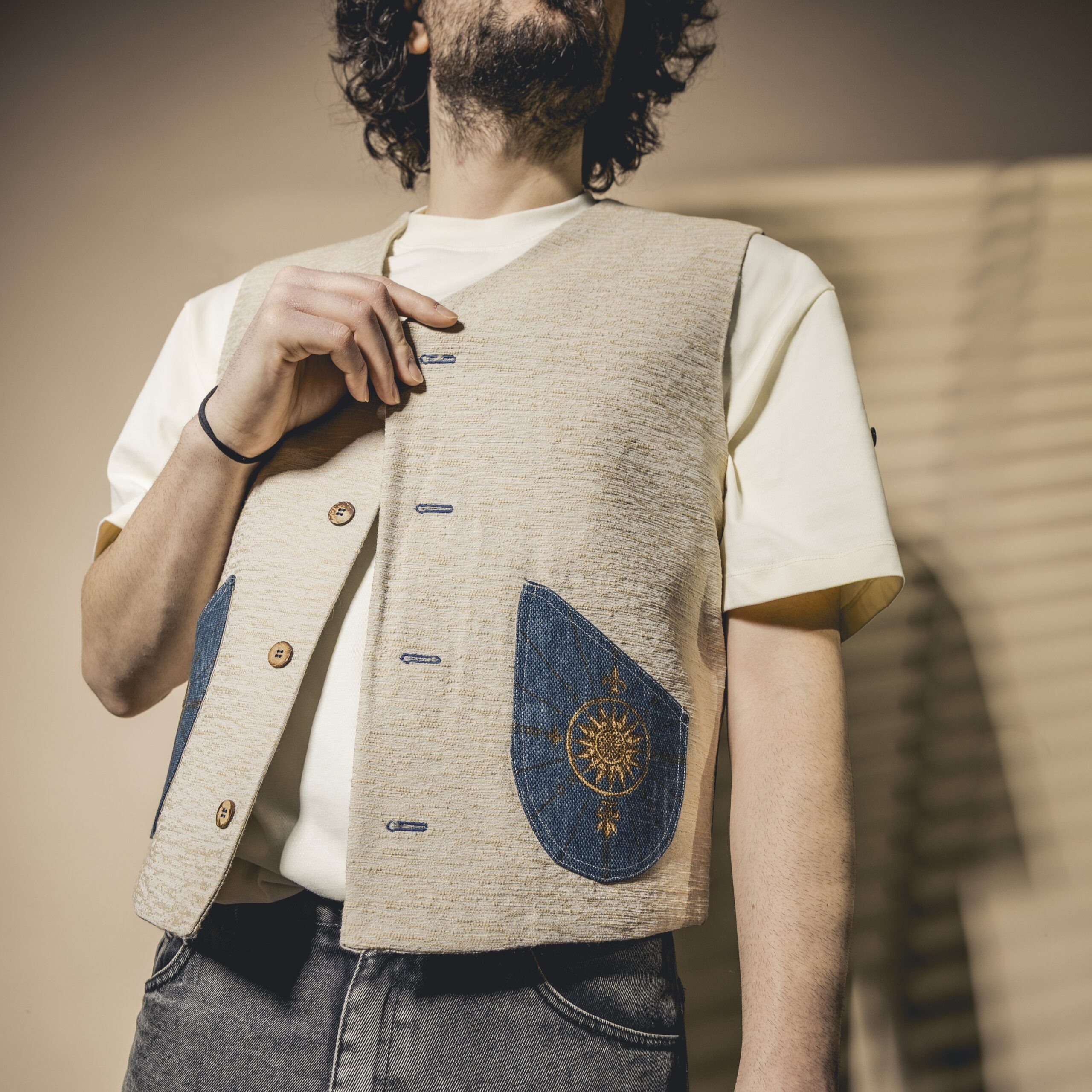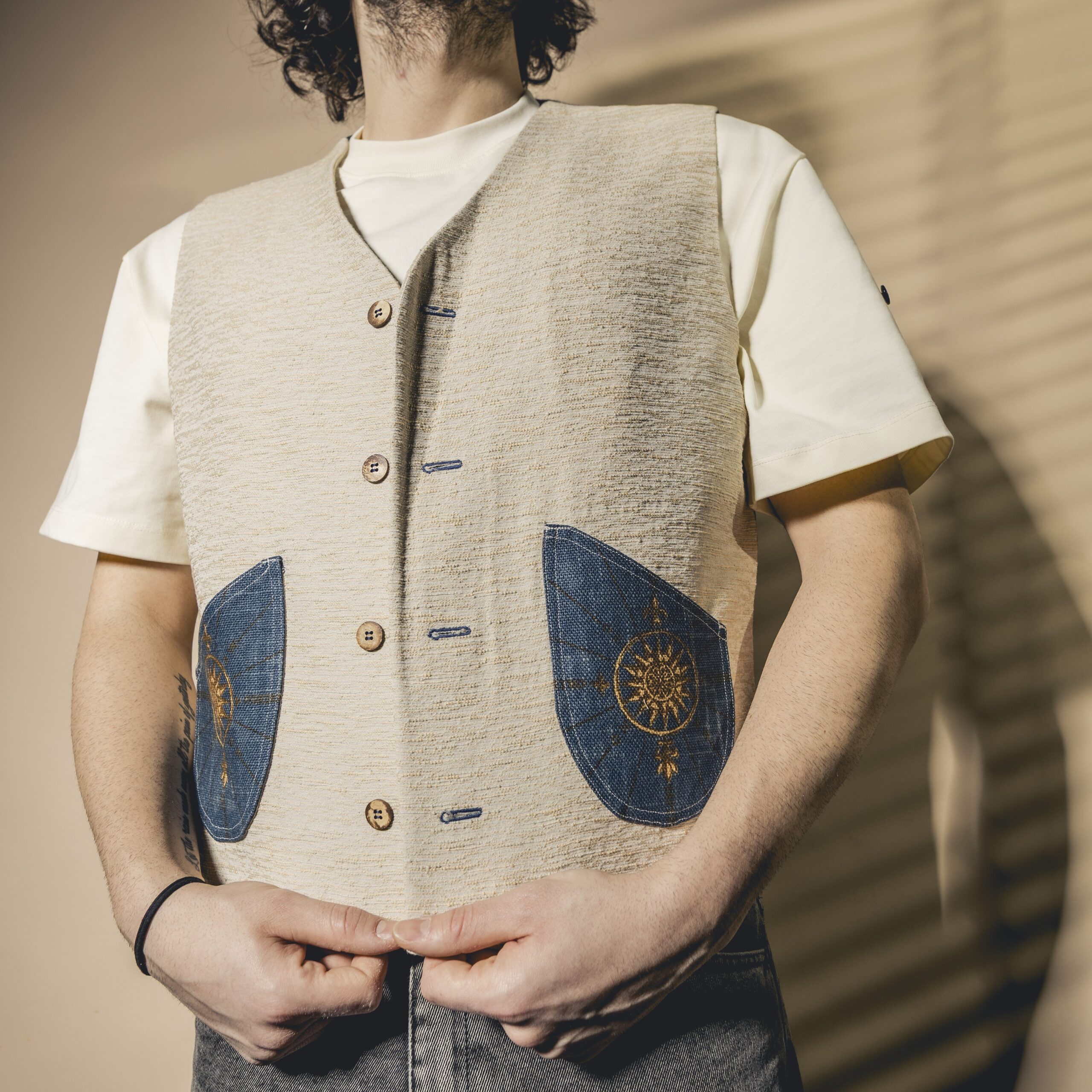 Il tessuto utilizzato per la parte frontale è definito broccato; la sua caratteristica principale è il suo disegno in rilievo. Questo si ottiene aggiungendo altre trame sopra il fondo, dal quale quindi si staccano nettamente. Su di esso sono stati applicati ritagli di un tessuto premium, realizzato tramite un intreccio di fili perpendicolari tra loro; l’operazione per realizzarlo si chiama tessitura. Quest’ultimo è lo stesso che compone anche il retro del gilet. Fodera piuma in tinta per mantenere un’armoniosità di colori, unita al tessuto tramite lavoro artigianale. Bottoni in cocco.